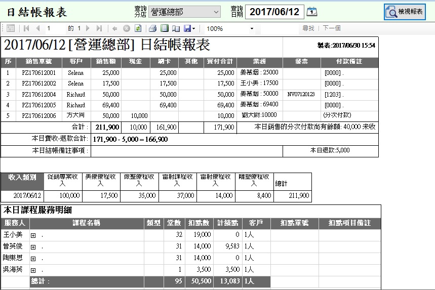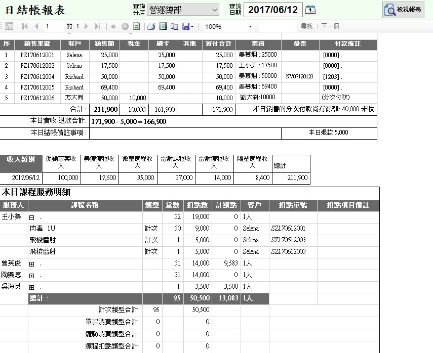 當日客戶消費金額/付款方式/承辦業務、各類收入類別總額以及每位服務人員服務明細,以及新客/舊客分別消費總額等資訊