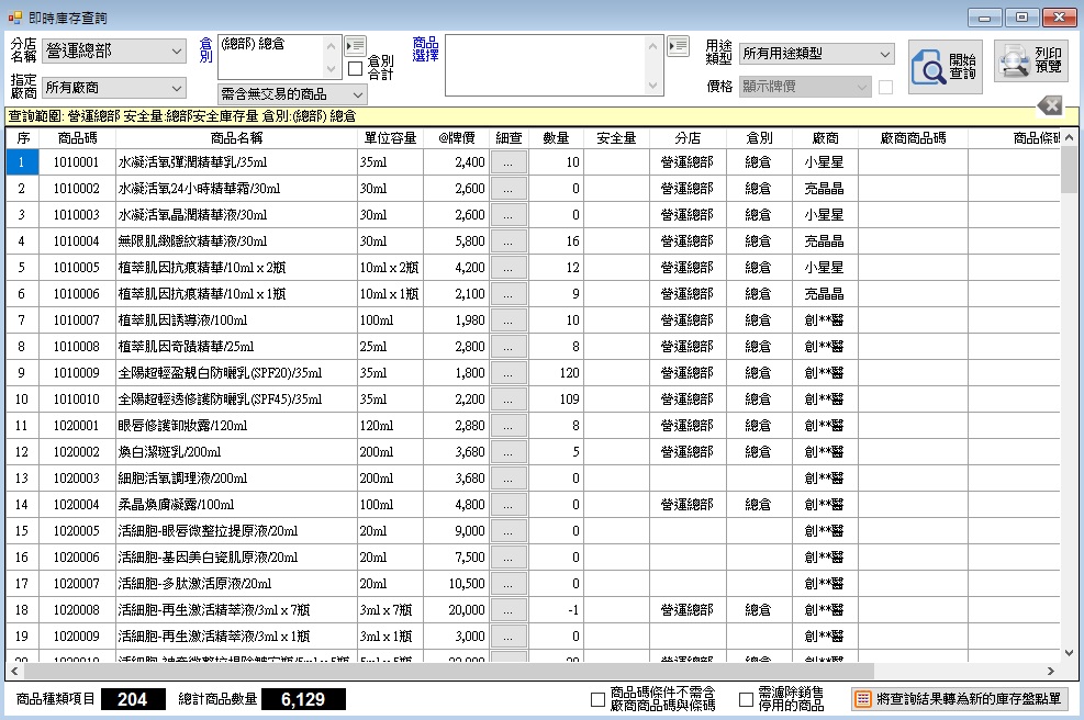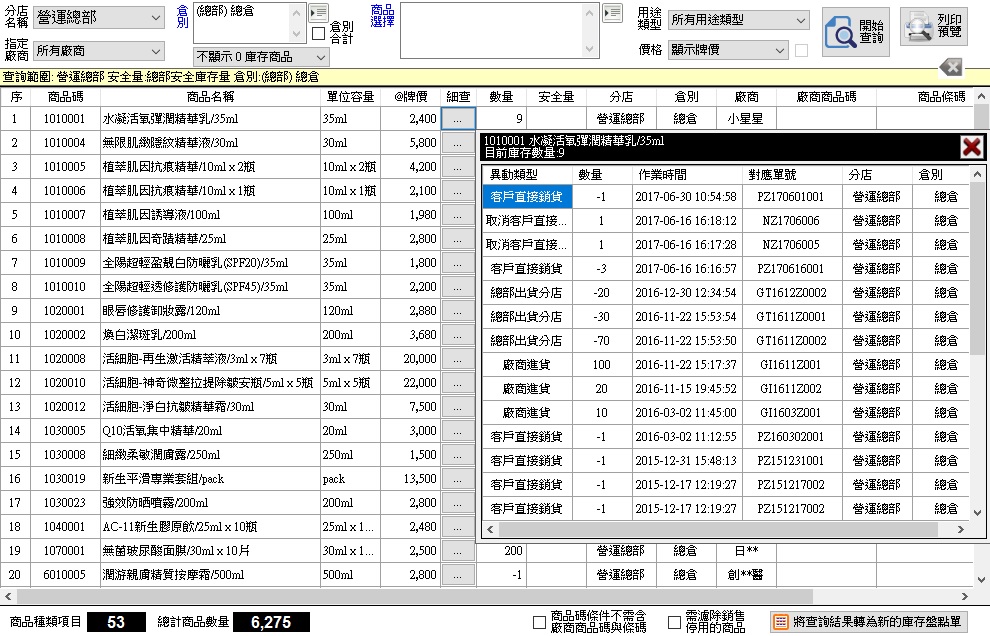 隨時掌握營運總部或分館的即時庫存數及細查資料