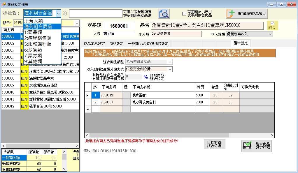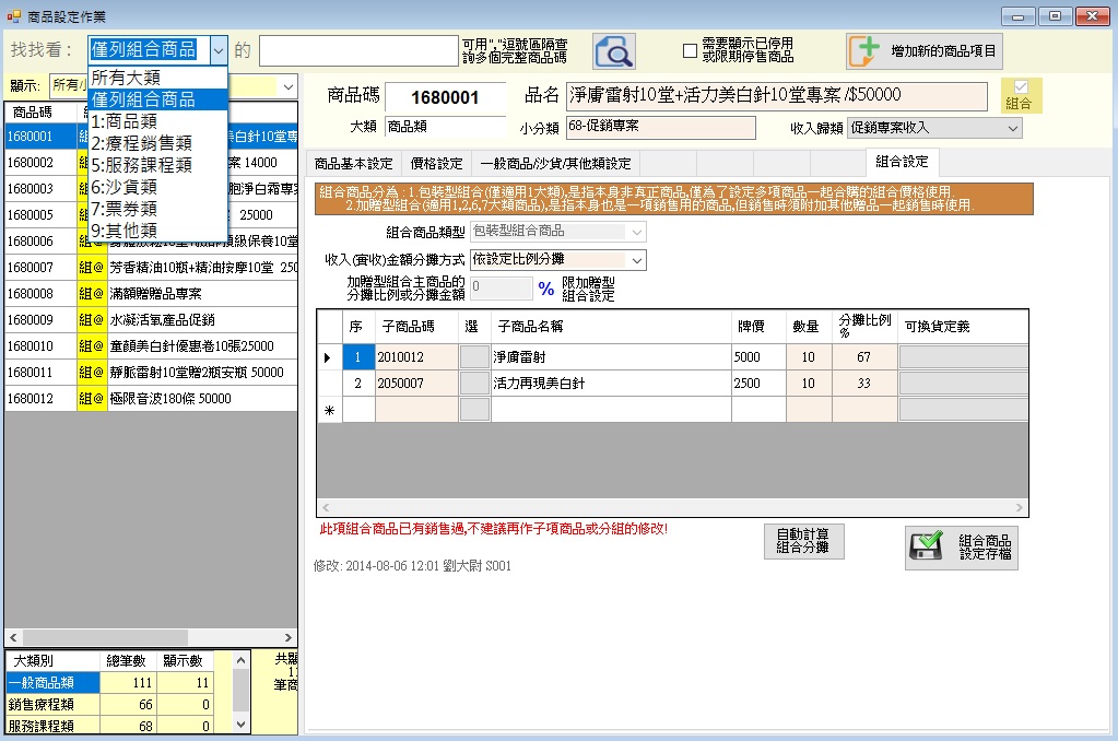 除了一般療程及商品外,豐富又彈性的『組合設定』功能-滿足您各種多元化的行銷活動