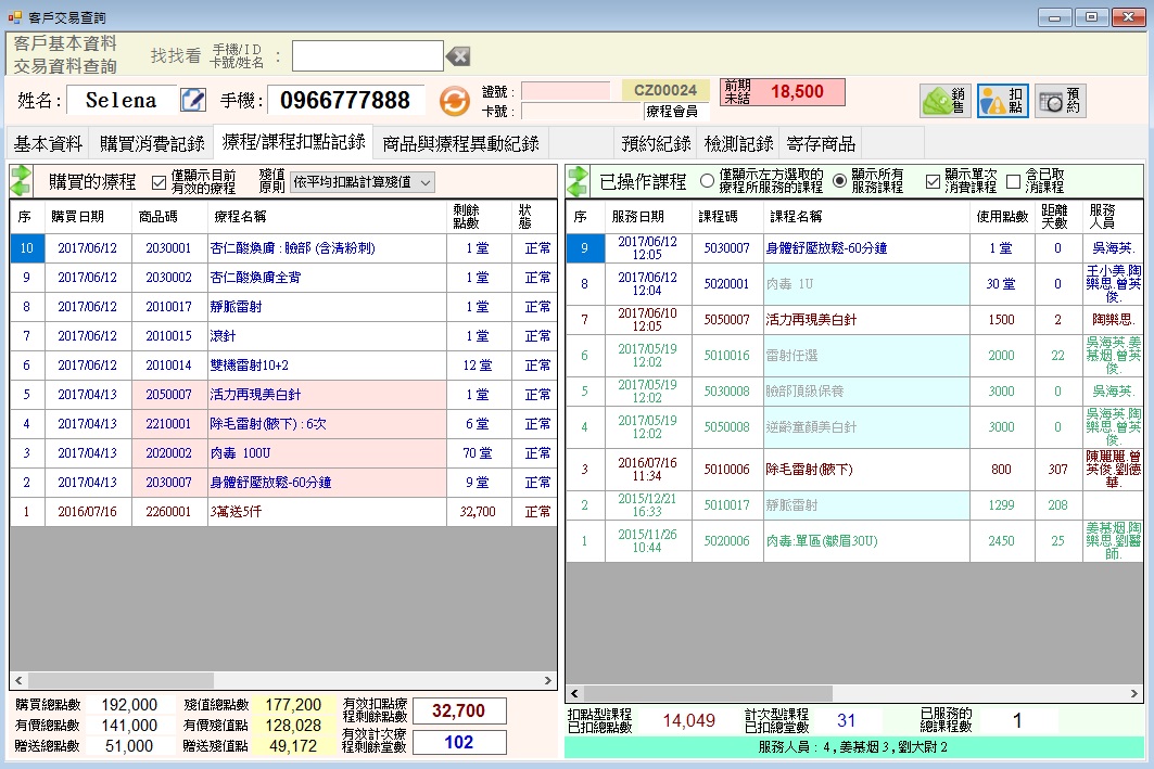 詳細紀錄客戶所有交易紀錄:消費、扣點、剩餘儲值、療程異動、預約紀錄等